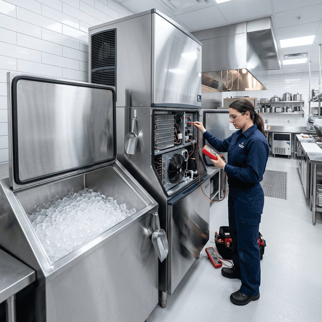 La production de glace est un équilibre délicat entre thermodynamique (froid) et dynamique des fluides (eau). Nous traitons les pannes des deux environnements simultanément.
